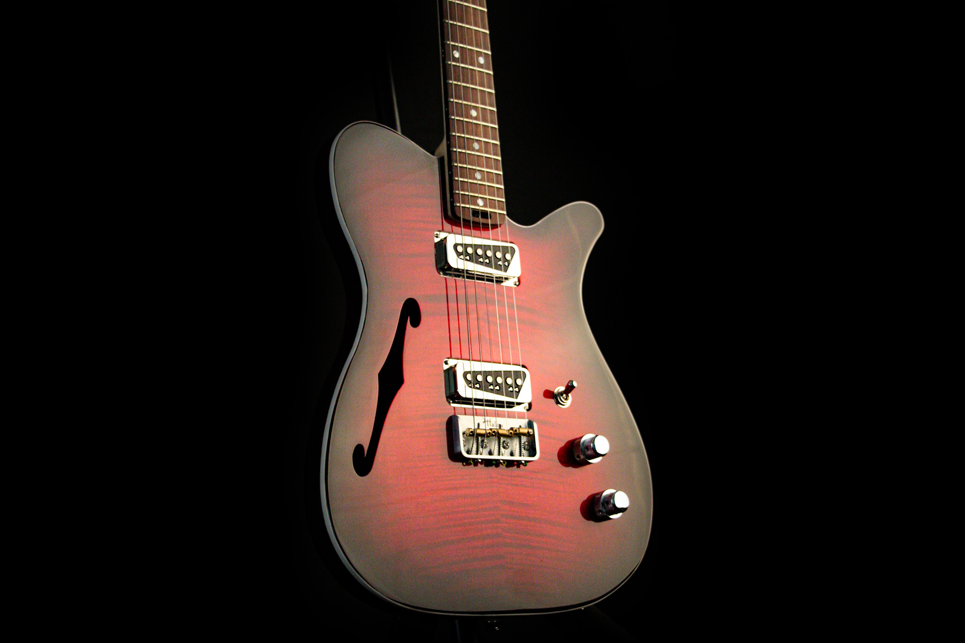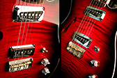 Nous avons choisi un corps en black limba (korina) et une table en érable flammé, ce qui donne un très bon équilibre sonore avec un bon sustain.
