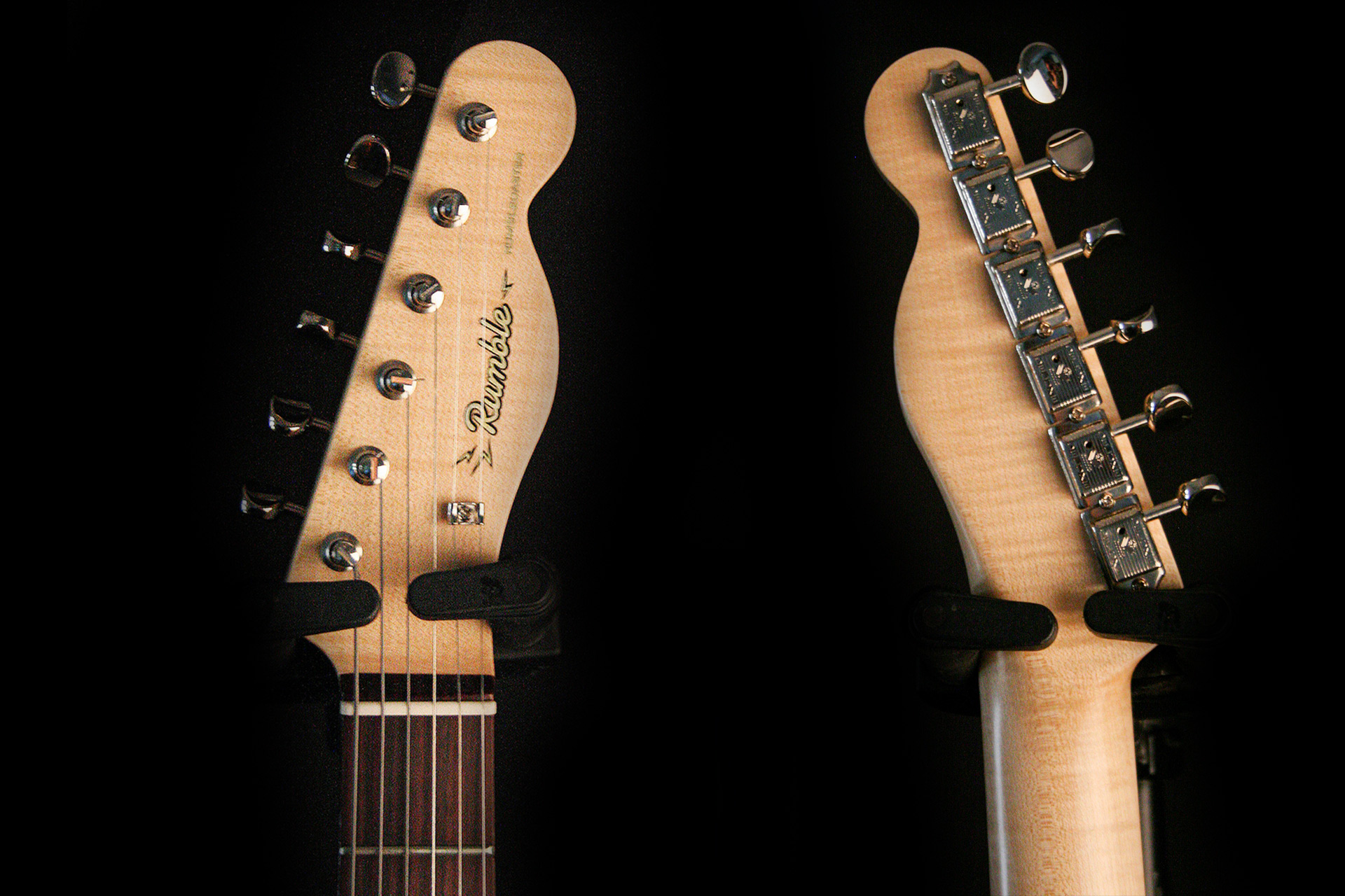 Elle est équipée de mécaniques à blocage afin de pouvoir changer les cordes rapidement en concert. Le client a voulu un chevalet en Top Load (cordes non traversantes) pour cette même raison.